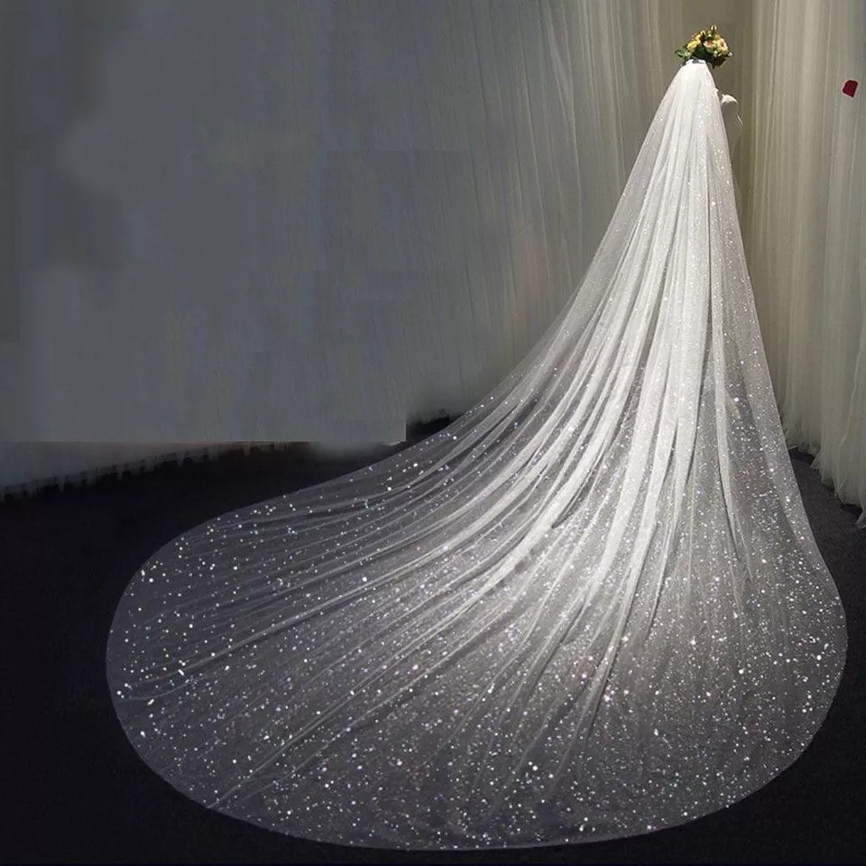Ніжна блискуча фата з напиленням надасть образу нареченої загадковості, таємничості. Цікава гра світла на поверхні аксесуару виглядає приголомшливо, ця весільна фата довга чудово доповнить навіть просте, лаконічне плаття, створюючи вишуканий романтичний образ.