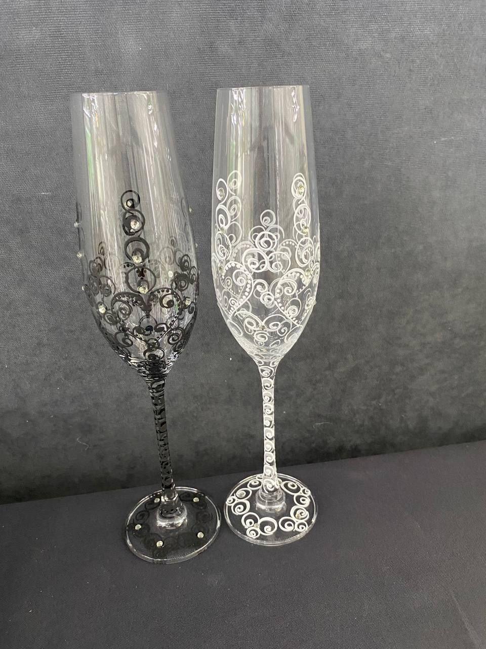Пара декоративних келихів від чеського бренду Bohemia стане стильним акцентом весільного свята. Кожен келих оформлений вручну, з використанням стразів і витончених вензелів, що надає композиції особливої вишуканості та символічності.