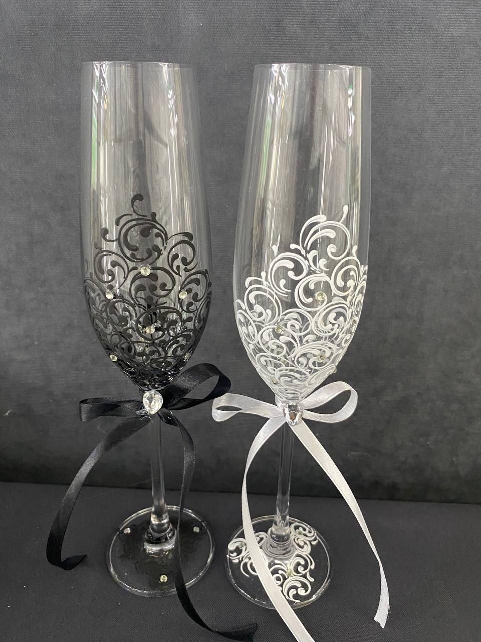 - Ручний декор: Кожен келих прикрашений витонченими вензелями, блискучими стразами і атласним бантиком.
