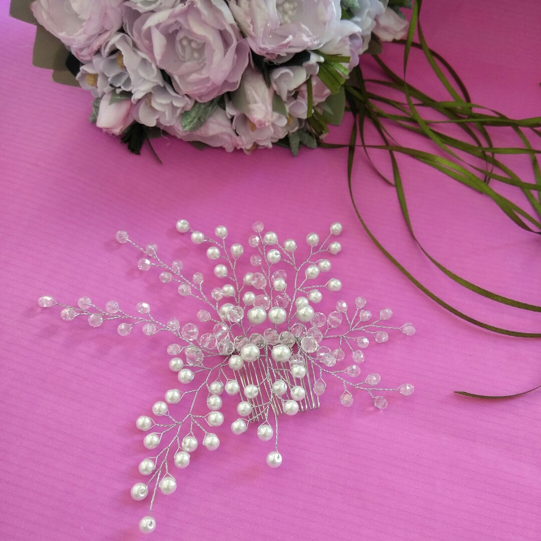 Весільний гребінь із білосніжних намистин під перли. Прикраса підійде для весільного образу зі зібраним волоссям. Надійно фіксується в зачісці. Гілочки прикраси можна злегка поправляти за формою зачіски.